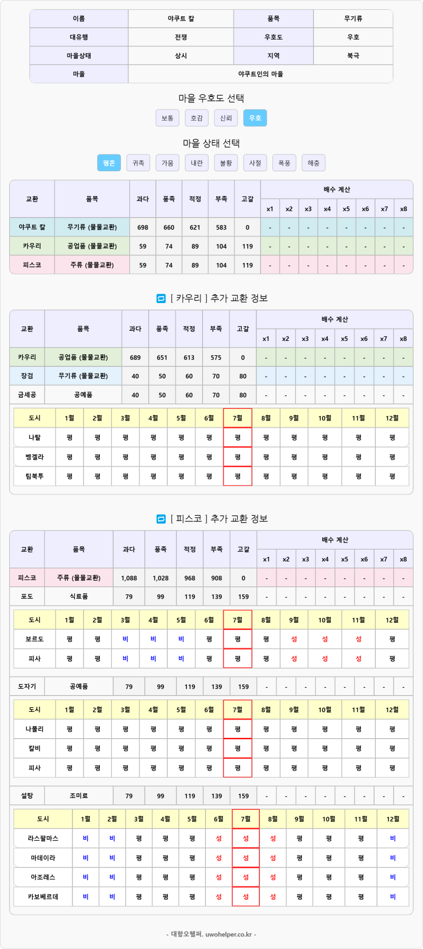 패치노트 분류 250414 - 물교계산기 수정 작성자 정보 제주도 작성 작성일 2025.04.12 20:58 컨텐츠 정보 895 조회 0 추천 목록 본문 1. 교역품정보 표시 및 판매도시, 기후정보, 인게임 "월" 안내 기능 추가. 2. 스펙입력 정보 상세기록 추가. 3. 일부 db 수정 0 추천 SNS 공유 관련자료 이전 물교품 시세표 삭제 작성일 2025.04.15 20:06 다음 250411 - 물교계산기 수정작업 작성일 2025.04.11 19:22 댓글 0 등록된 댓글이 없습니다. 로그인한 회원만 댓글 등록이 가능합니다. 목록